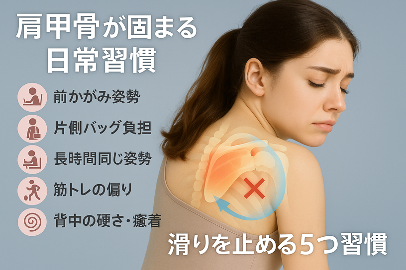 緊張すると肩がすくむように上がってしまう人も少なくありません。こうしたクセが長期的に続くと、肩まわりの筋肉がこわばり、姿勢が硬くなってしまいます。