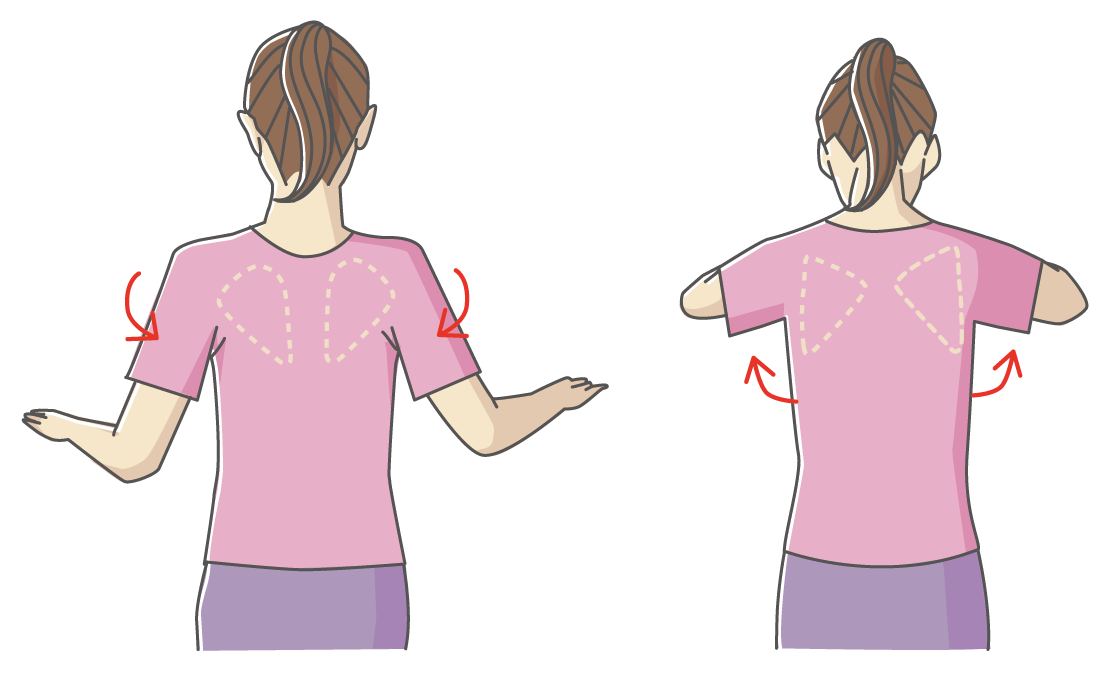 背中のこりを感じるときにおすすめなのが、簡単な“肩甲骨まわし”です。方法は以下の通り。