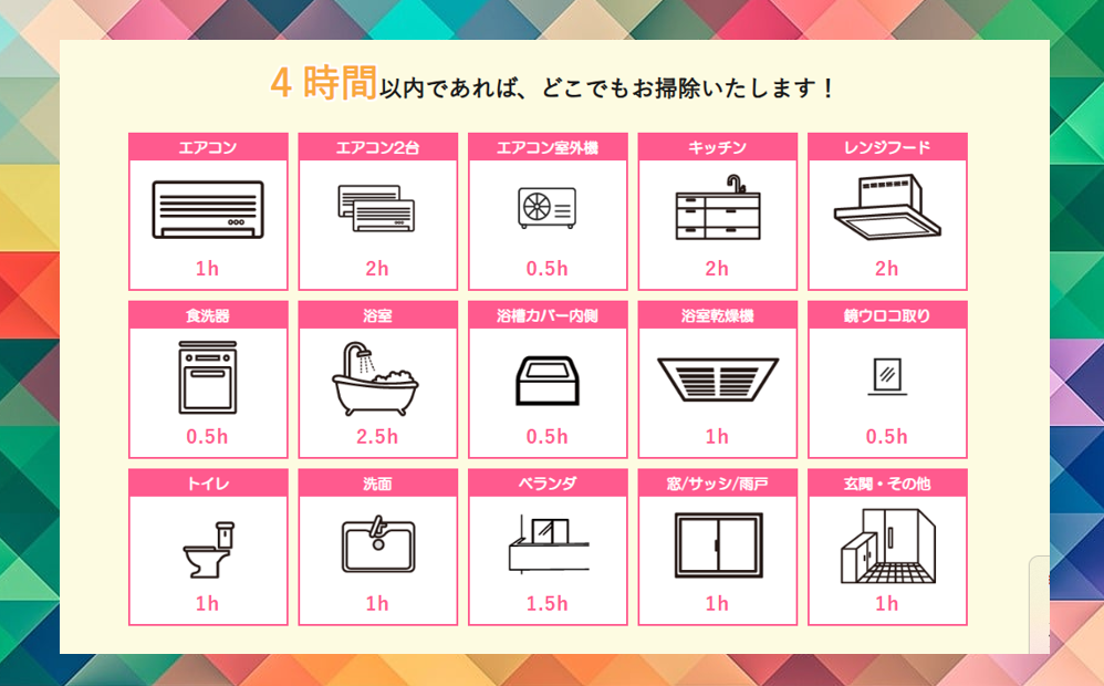 - 選べる時間制:4時間パックで集中した清掃が可能。