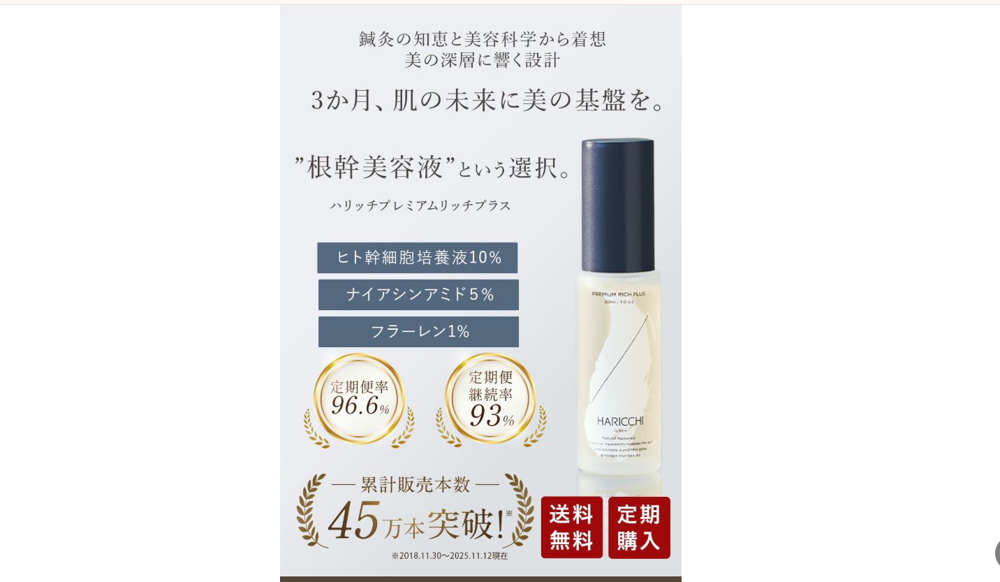 ショップチャンネルで即完売したという事実は、それだけ多くの方が「本当の変化」を求めている証拠です。銀座の高級サロン「ハリッチ」の技術が詰まったこの一本は、あなたの肌を潤いで満たし、鏡を見る時間を楽しみに変えてくれるはずです。